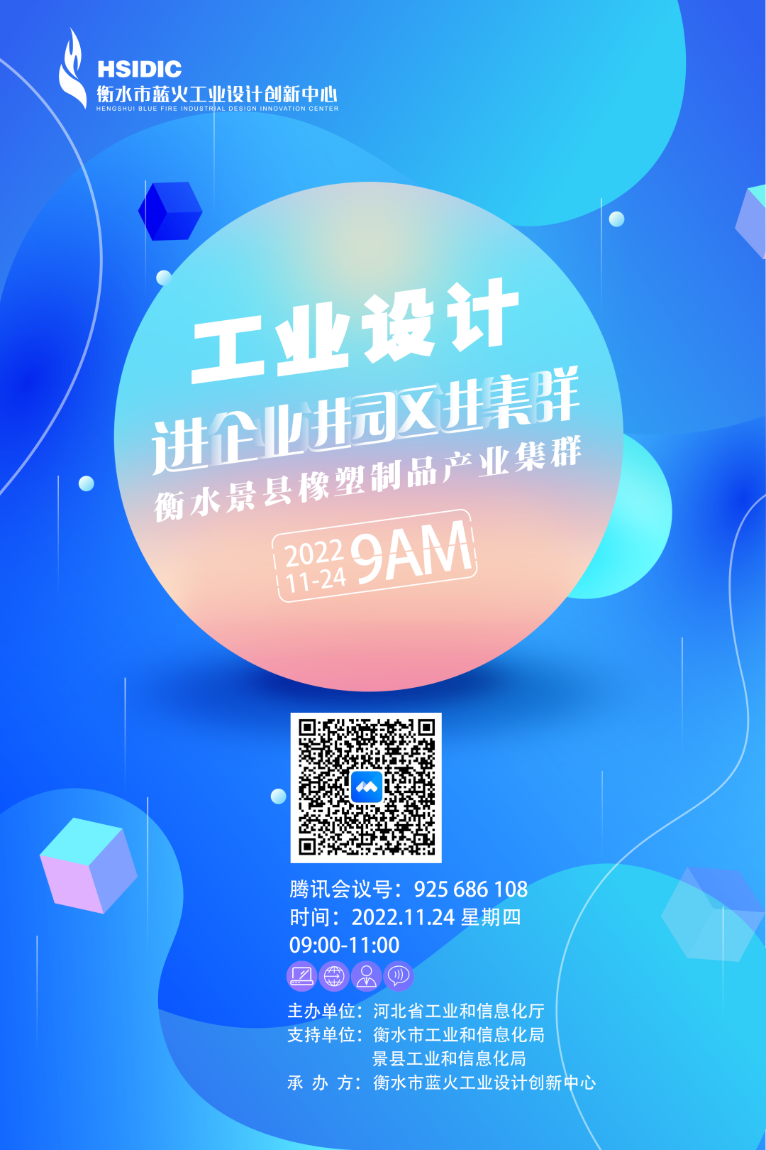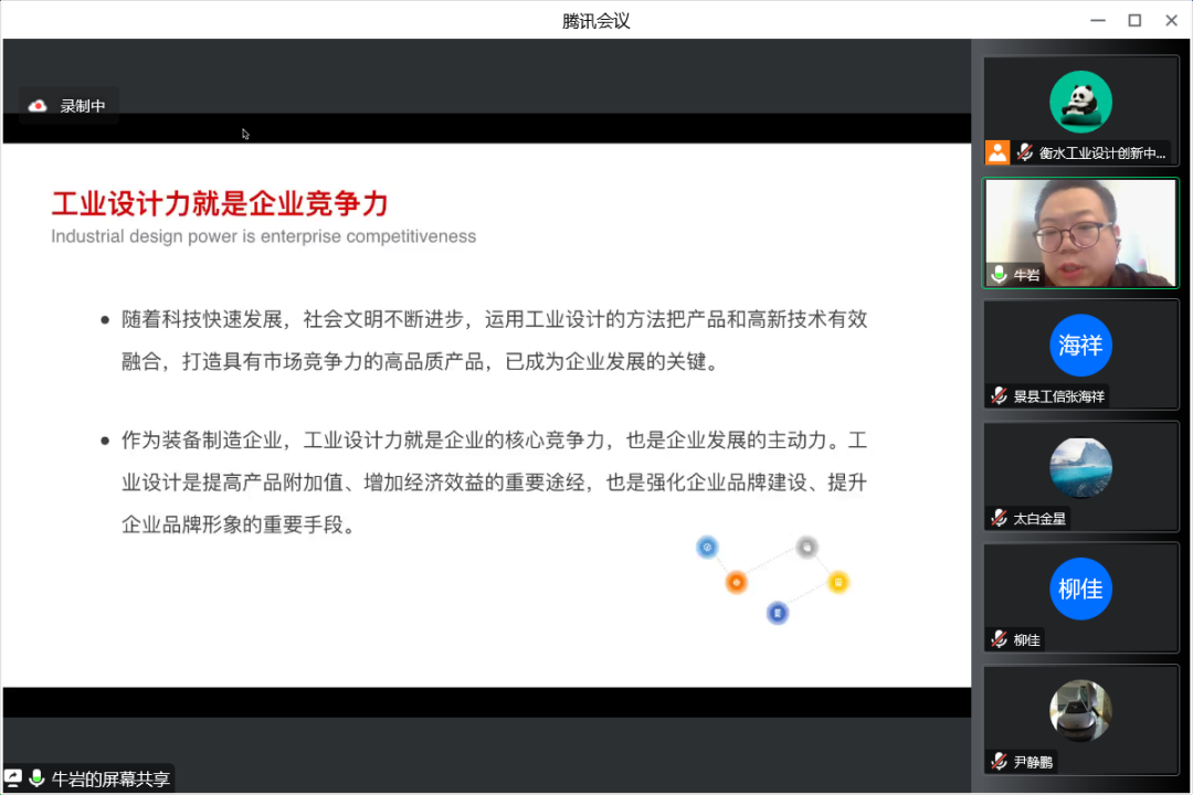 本次活动由河北省工信厅主办,衡水市工信局和景县工信局作为支持单位,衡水市蓝火工业设计创新中心承办,采用线上直播的方式举行。活动邀请河北立意工业设计有限公司总经理牛岩,河北省机械科学研究设计院产业政策研究室主任、高级工程师、省工信厅专家库成员尹静鹏主任作为主讲嘉宾,景县工信局张海祥副局长及相关科室负责人、景县橡塑制品产业集群50余家重点企业代表参会。