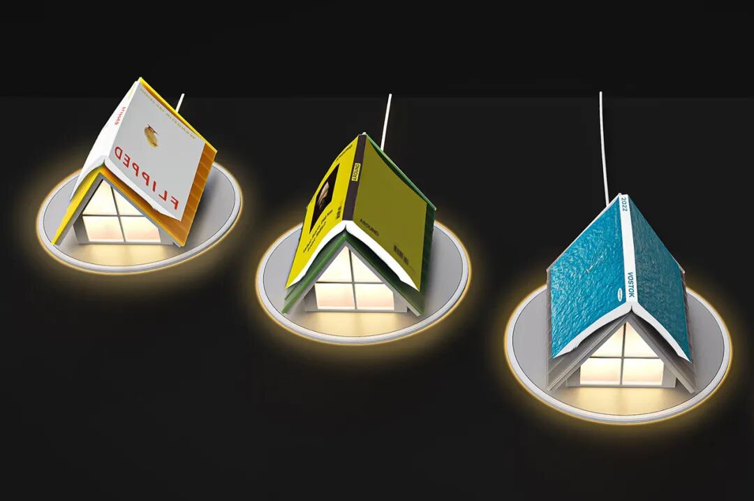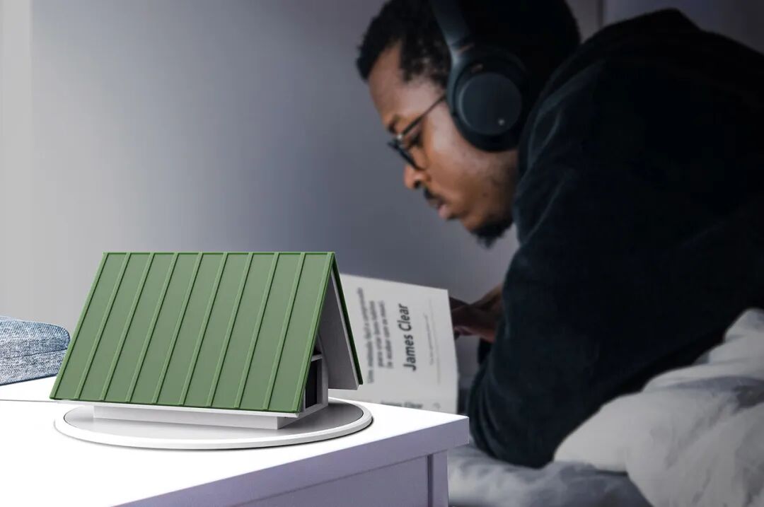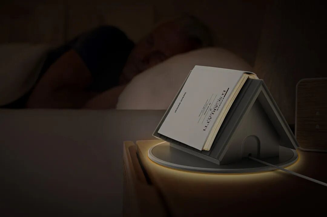 BOOF 阅读灯的形状像一座房子,基本上是放在一个金属圆盘上,但当你把一本书放在它的屋顶上时,窗户和房子底层的微妙光线会亮起来。在这里,三角形的屋顶作为你放在上面的书的天然书签。