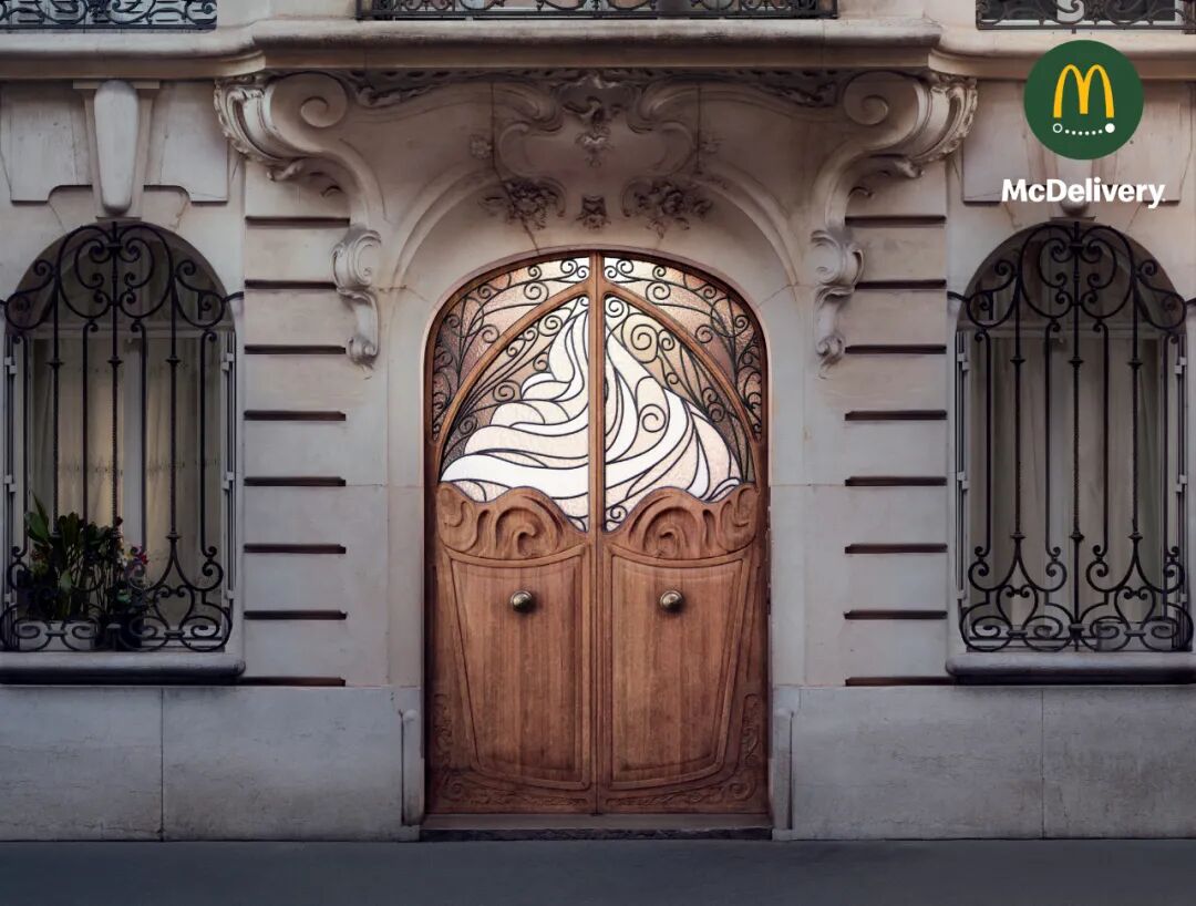 巴黎TBWA团队以巧妙的设计将冰淇淋、薯条和汉堡融入各种建筑物的大门,通过丰富的想象力引人注目,以此强调麦当劳的送货上门服务。此前,巴黎TBWA团队还为麦当劳推出过“No Logo”的海报,没有标志,没有品牌签名,而是像像素艺术一样隐藏的产品,并配以“猜猜谁会来到你的城市”。
